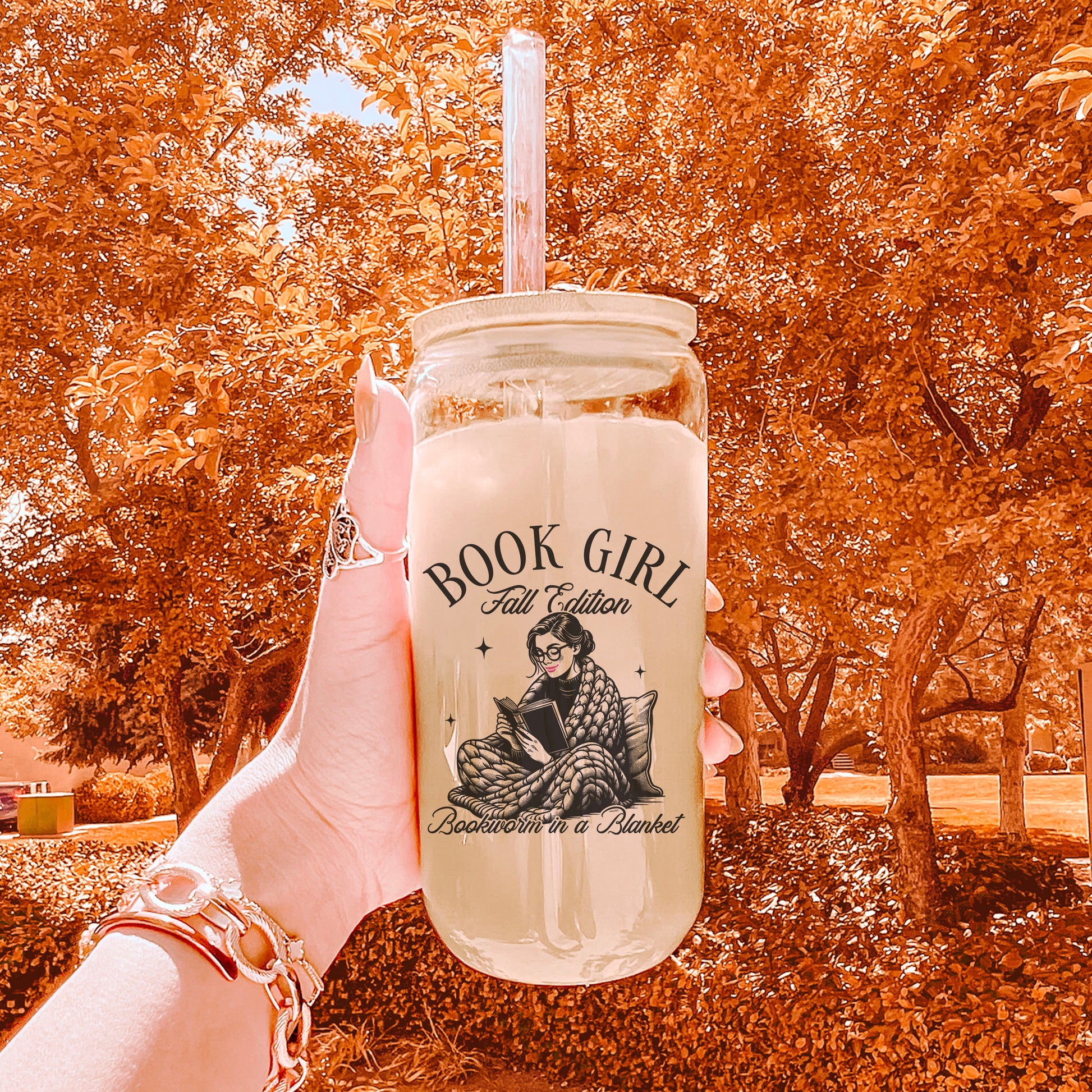 Book Girl Fall Edition 16oz Clear Glass Cup | Perfect for Cozy Reading Sessions