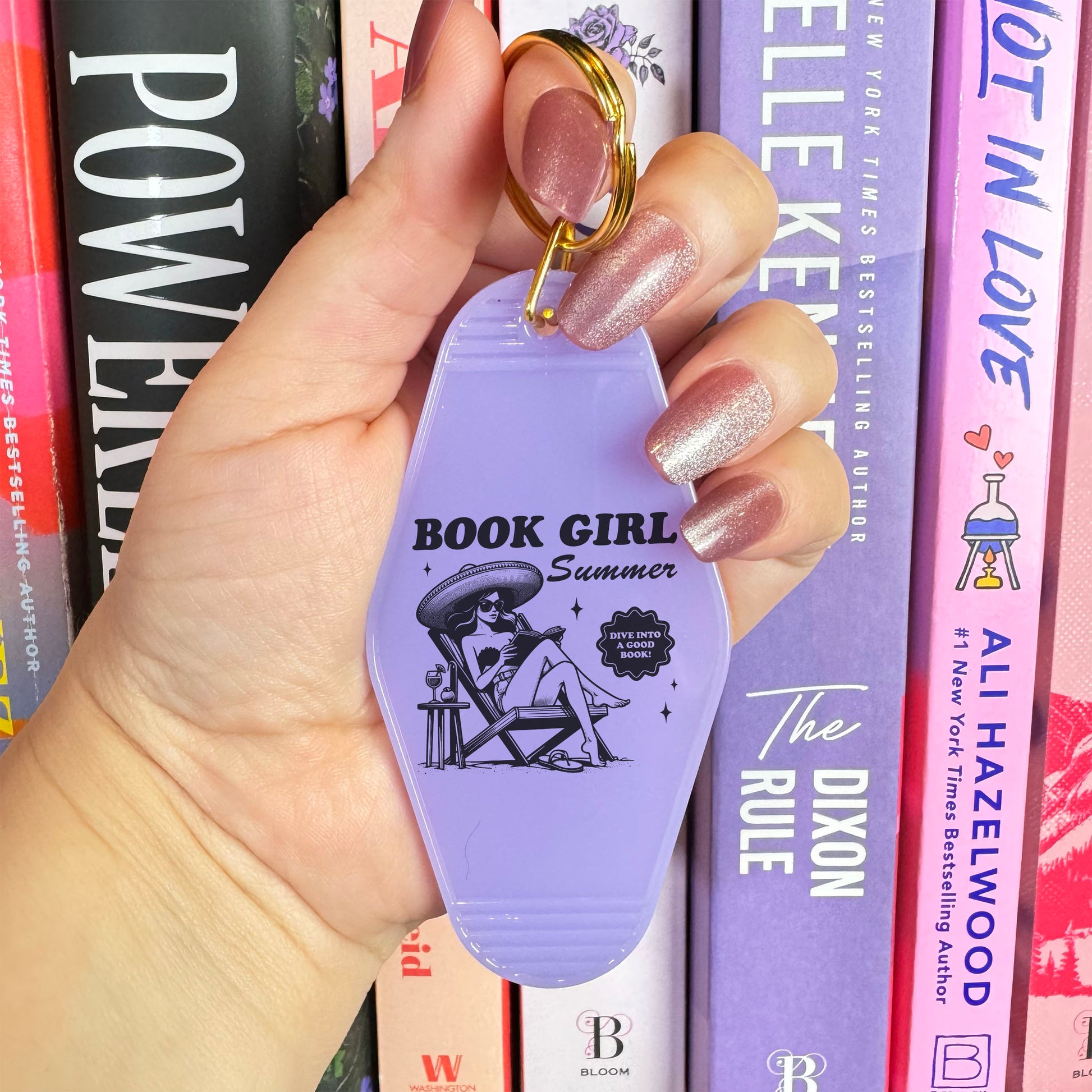 Bring some retro charm to your bookish summer with our Book Girl Summer motel-style keychain. Featuring a bold pinup reader design and the phrase “Dive into a Good Book,” this double-sided keychain is UVF printed with permanent detail for long-lasting summer vibes. Lightweight and durable with a classic motel silhouette, it’s the perfect accessory for your car keys, beach bag, book tote, or vacation suitcase. Available in several bright colors, this keychain is a stylish reminder that every hot girl summer is a book girl summer.