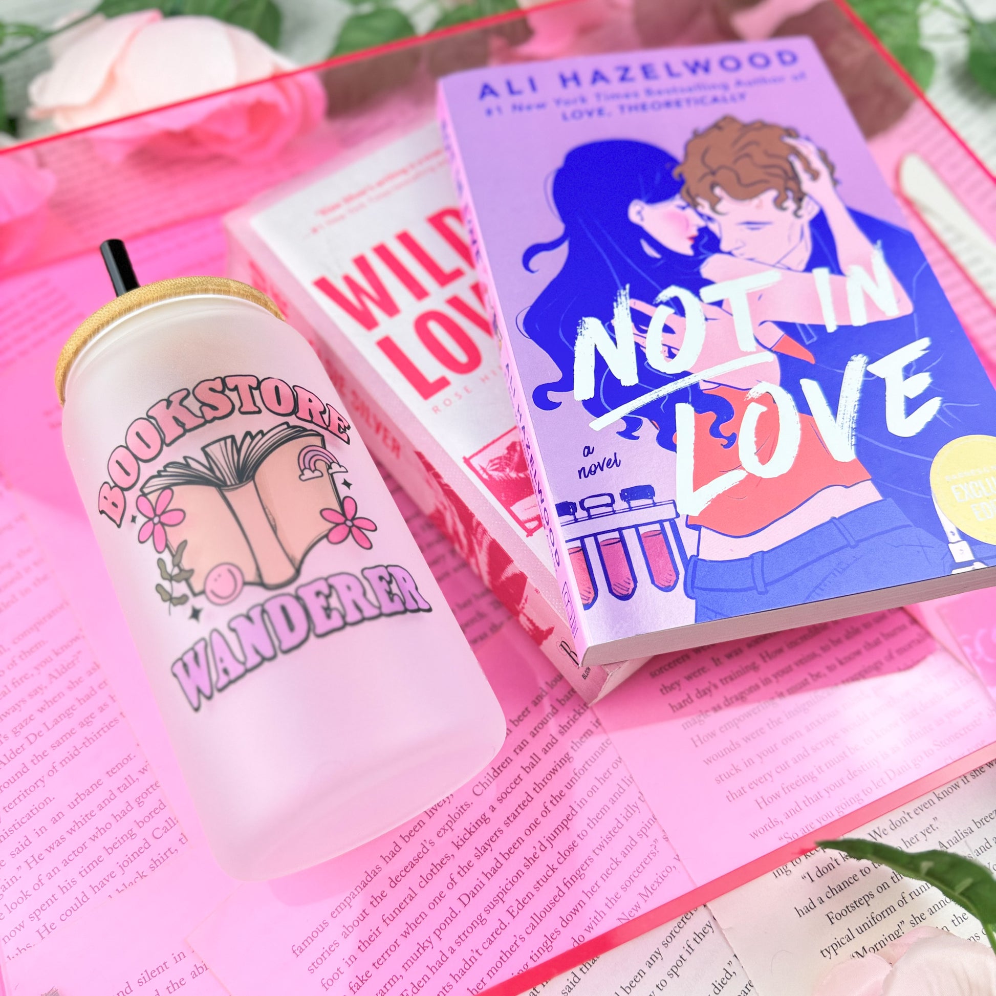 Keywords: bookstore wanderer cup, frosted glass cup, bookish drinkware, bamboo lid cup, reusable straw cup, iced coffee glass, book lover cup, bookish aesthetic glass, glass cup with lid, plastic straw cup, upgrade glass straw, pink glass straw, black glass straw, bookish glass cup, book-themed drinkware, eco-friendly bookish cup, reader glass cup, bookstore lover gift, bookworm gift ideas.