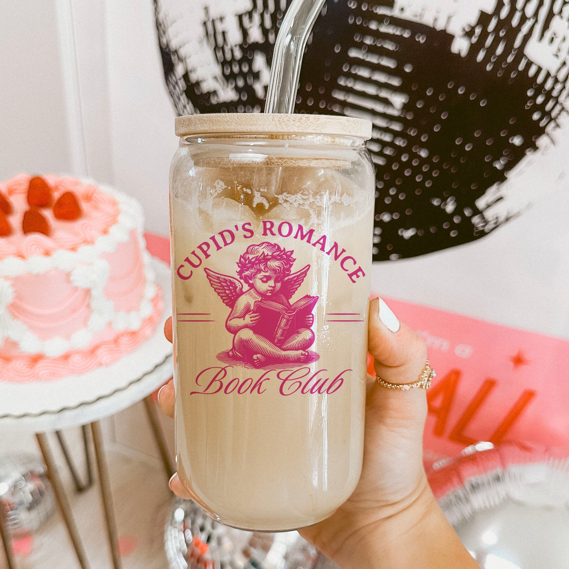 bookish glass cup, romance reader drinkware, clear glass cup, book club cup, cupid book design, valentines bookish drinkware, reader gift, iced coffee glass, book lover cup, literary drinkware, bookish aesthetic cup, romance book merch, reader lifestyle item, bookish valentines accessory, coffee cup for book lovers