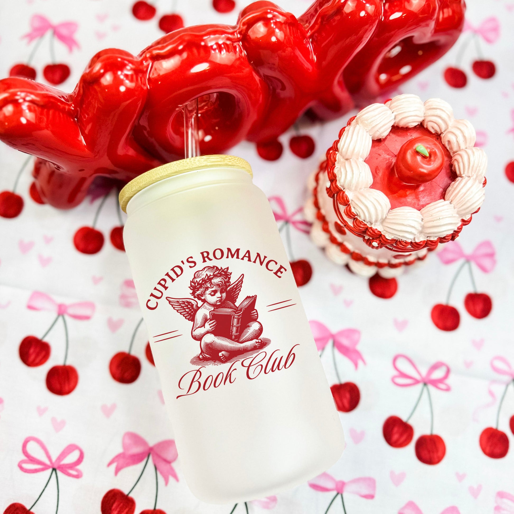 This frosted glass cup features the Cupid’s Romance Book Club design printed on one side with a high quality print. Finished with a bamboo lid and plastic straw, it’s perfect for iced coffee, tea, or cozy reading drinks during Valentine’s season.