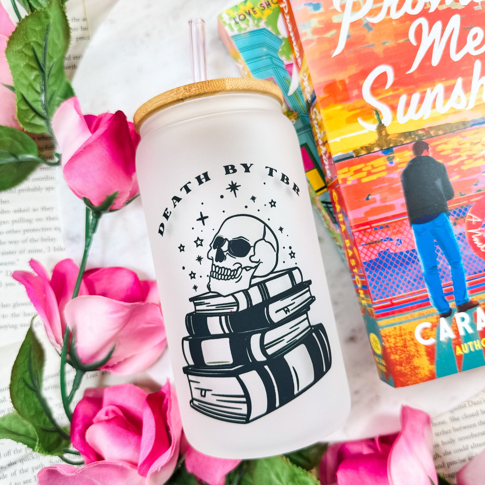 Sip your favorite beverage in style with the "Death by TBR" frosted glass cup. Designed for avid readers and lovers of all things bookish, this 16oz cup features a durable bamboo lid and a reusable plastic straw. Perfect for cozy evenings spent devouring your TBR pile, this cup is not just a drinkware essential but a bookish statement piece.