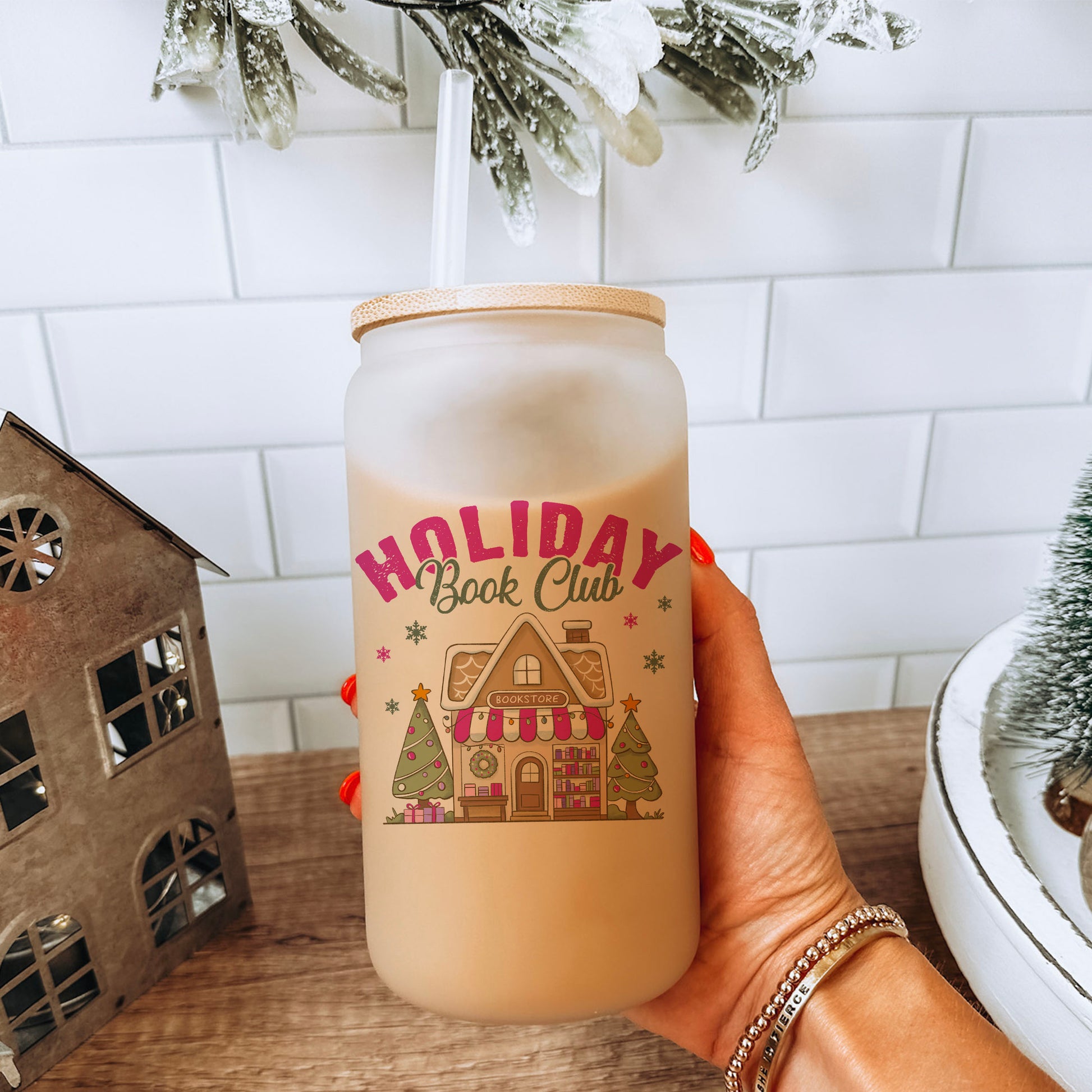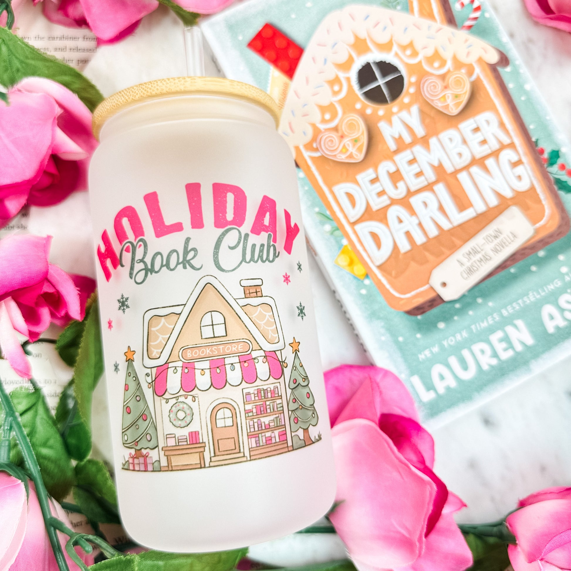 Holiday Book Club cup, frosted glass cup, bookish Christmas cup, holiday reading glass, gingerbread bookstore design, book lover Christmas gift, festive bookish drinkware, Christmas coffee cup, bibliophile Christmas gift, cozy winter drinkware, holiday bookworm glass, festive reader glass, Christmas iced coffee glass, holiday reading accessory, eco-friendly bamboo lid cup, reusable straw glass, Christmas reader cup, holiday bookish merch, festive bookish cup, Christmas book lover drinkware, cozy reader glass, Christmas aesthetic cup, bookish holiday drinkware, festive coffee glass, Christmas gift for readers, cozy bookish drinkware, festive bookish accessory, bookish Christmas collection, holiday beverage glass, reader holiday cup, bookish festive glass, cozy bookish coffee cup