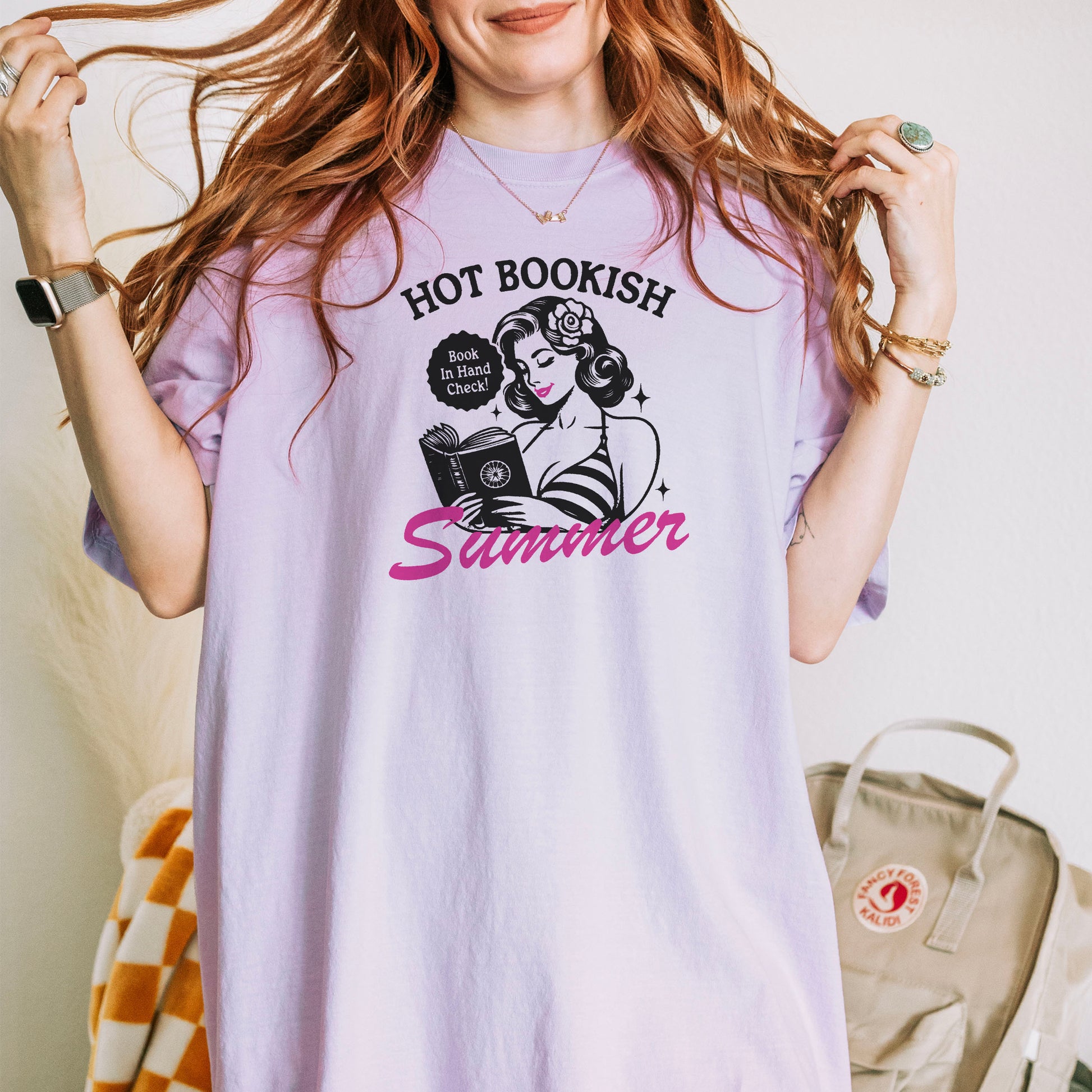 Bring your summer reading vibes to life with this "Hot Bookish Summer" Comfort Colors heavyweight tee. Featuring a retro pinup girl devouring a spicy read and the cheeky “Book in Hand Check!” bubble, this thick, ultra-soft shirt makes the perfect bookish fashion statement. Designed for readers who proudly embrace smut, spice, and sun, it's your go-to for cozy bookstore runs, iced coffee hauls, and lazy days flipping pages outdoors.