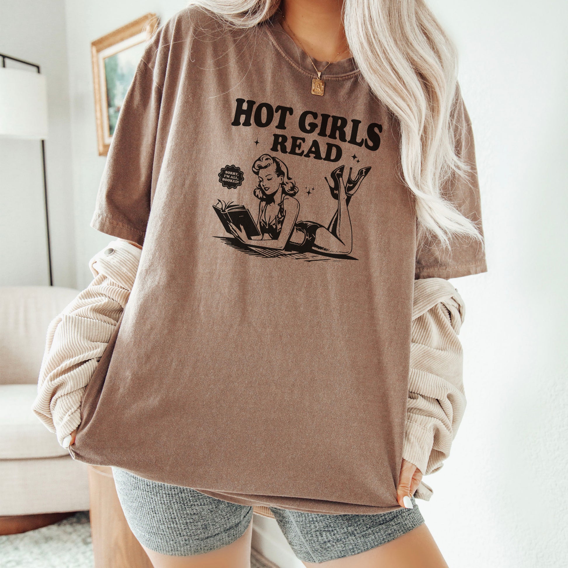 Turn up the heat on your summer reading with our "Hot Girls Read" Comfort Colors heavyweight shirt—designed for book lovers who serve looks and chapters. This relaxed fit tee features a retro pinup-style reader sprawled out with a good book, declaring “Sorry, I’m all booked” in a playful nod to your TBR pile. Made from soft-washed, garment-dyed cotton for a perfectly lived-in feel, this shirt is breathable, durable, and endlessly stylish—ideal for lazy bookstore days, iced coffee runs, or lounging with your current favorite romance.