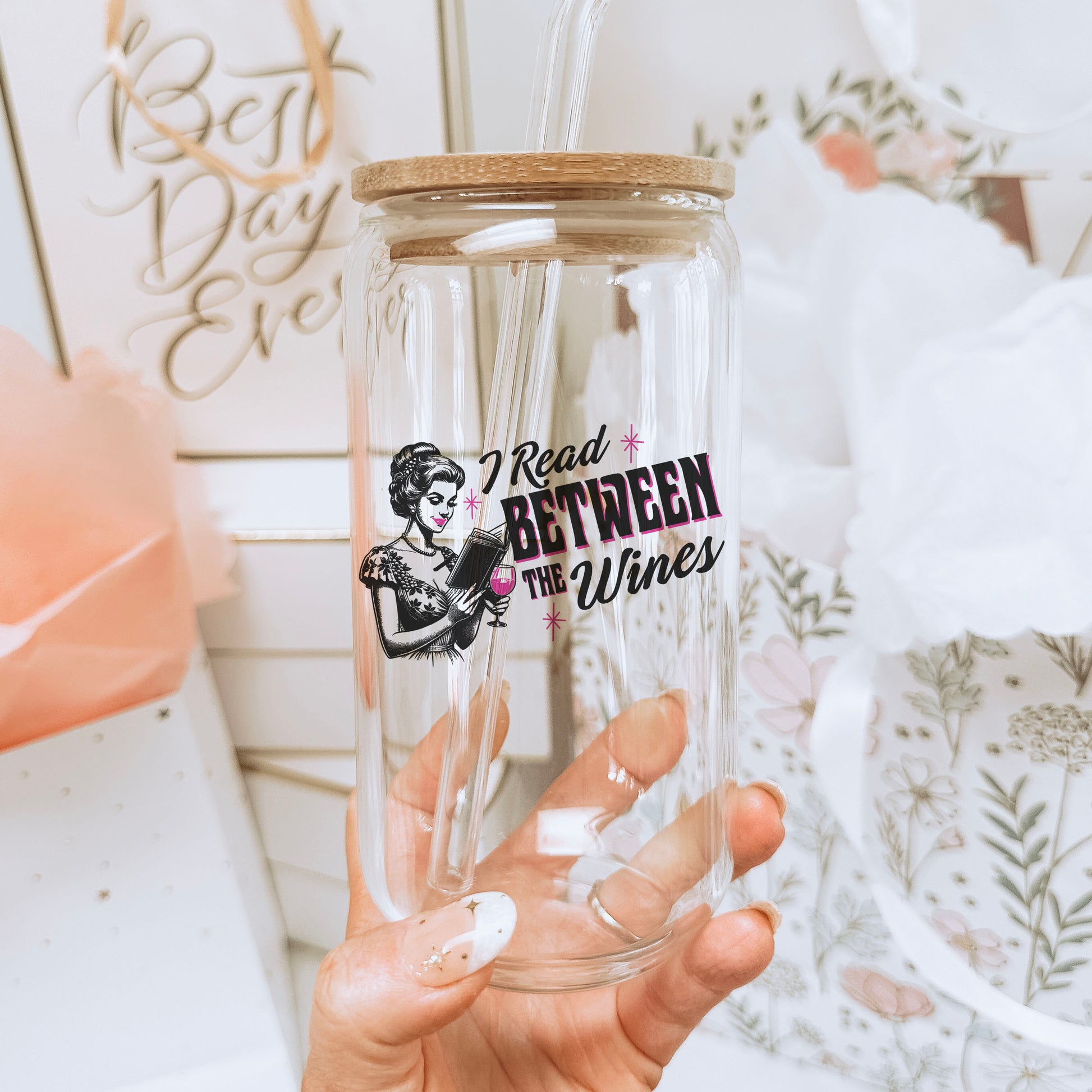 This clear glass cup showcases the playful I Read Between The Wines design, blending bookish charm with a clean, modern look. Perfect for iced coffee, tea, lemonade, sparkling drinks, or wine spritzers, this cup brings aesthetic joy to every reading moment. The high quality print pops beautifully on the clear glass, letting your drink shine through for a fresh and fun bookish vibe.