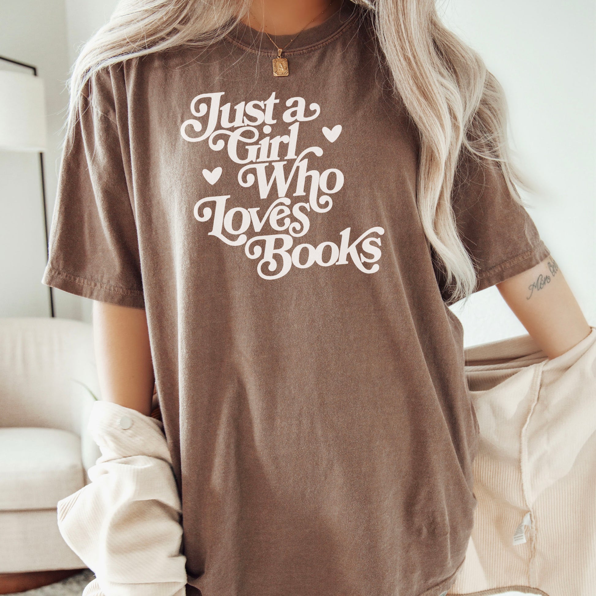 Show off your love for books with the Just A Girl Who Loves Books Comfort Colors shirt, a must-have for bookworms who adore cozy reads and stylish bookish apparel. This heavyweight tee is made from soft, high-quality cotton, perfect for lounging with your favorite novel or heading to a bookstore haul. Featuring a vintage-inspired design with a bold, retro font, this shirt is ideal for book lovers who enjoy literary fashion with a touch of nostalgia. Whether you're a romance reader, fantasy fan, or dark academia enthusiast, this aesthetic bookish tee is a fun addition to any reader’s wardrobe.