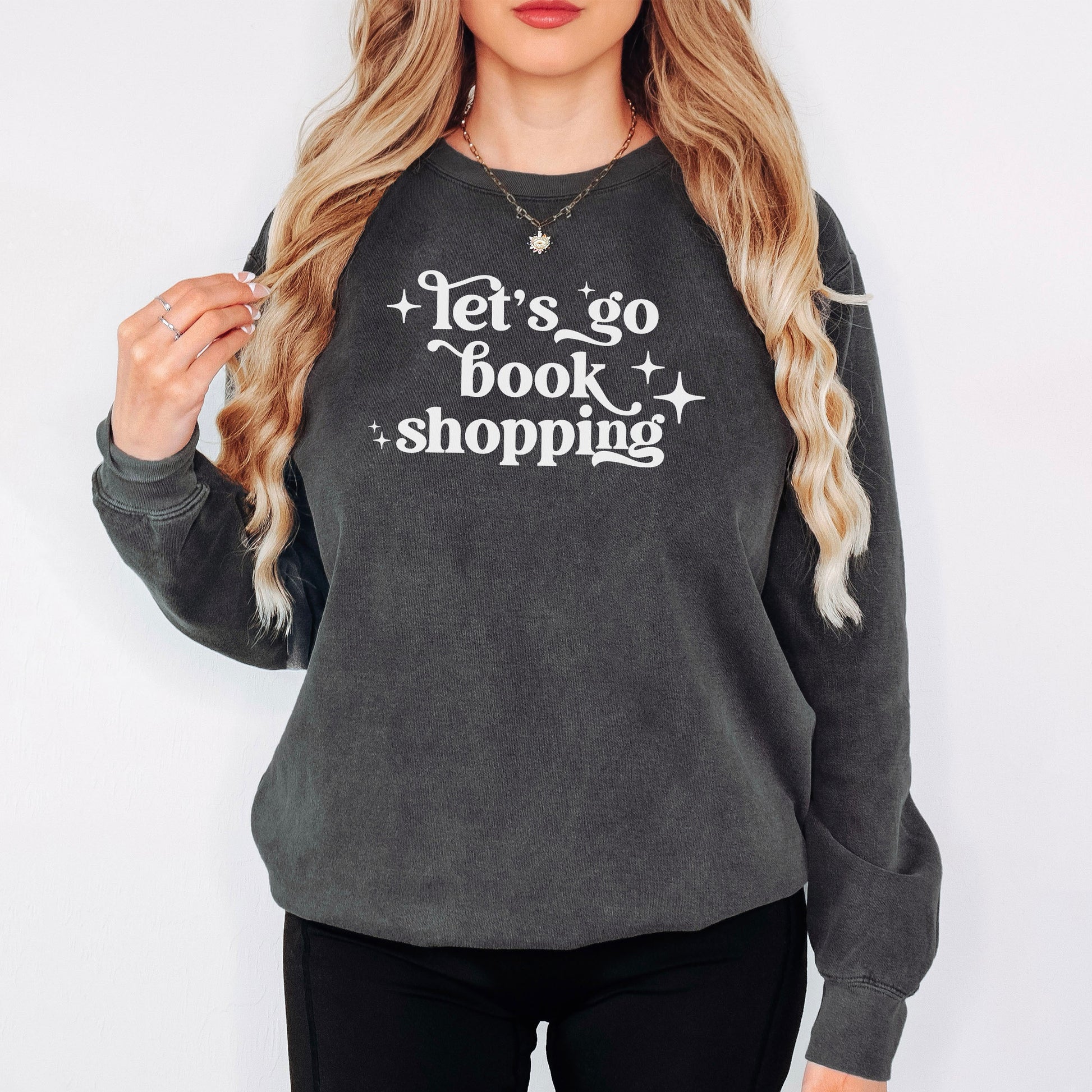 This lightweight Comfort Colors sweatshirt features the Let’s Go Book Shopping design, created for readers who treat bookstores like a destination and browsing shelves like a ritual. The playful hand-lettered typography with subtle sparkles captures that cozy anticipation of a bookstore visit, whether you’re planning a weekend trip to your favorite indie shop or just manifesting your next book haul. It’s an easy, feel-good piece that fits perfectly into any bookish wardrobe.
