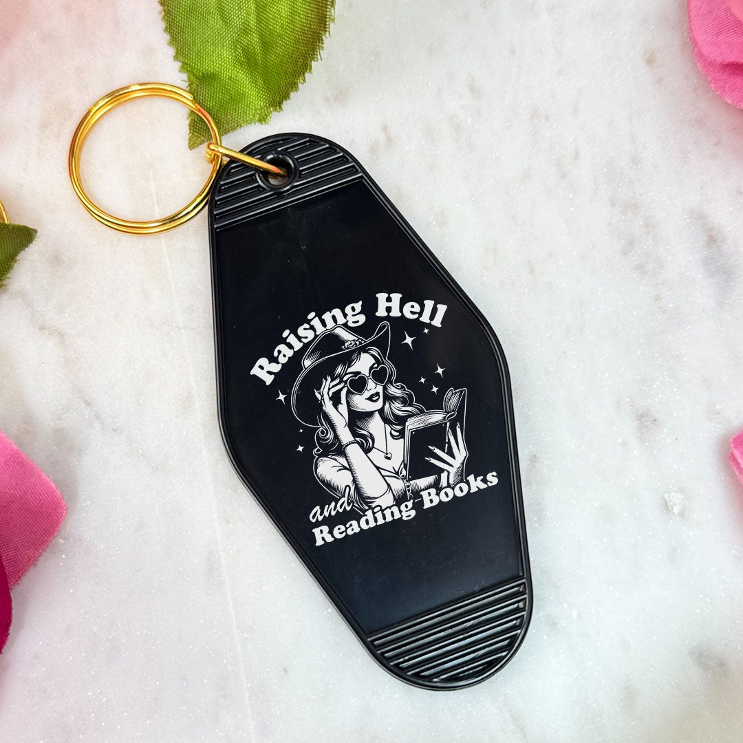 Raising Hell And Reading Books Retro Motel Keychain