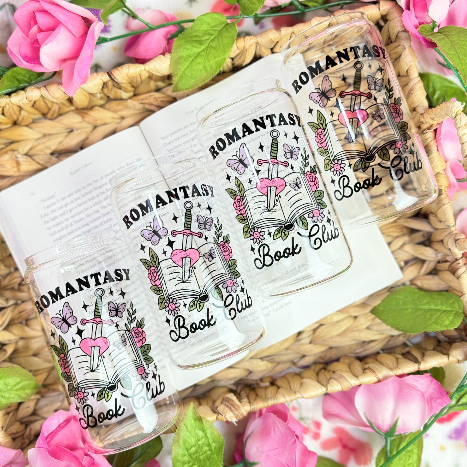 Sip your favorite drink in bookish style with this Romantasy Book Club clear glass cup, designed for lovers of romantic fantasy books. Featuring an enchanting design with a dagger-pierced heart, butterflies, and an open book surrounded by floral accents, this aesthetic glass is perfect for your iced coffee, tea, or any cozy beverage. Complete with a bamboo lid and plastic straw. Whether you’re binge-reading your favorite romantasy series or collecting bookish accessories, this durable and stylish cup is a must-have for your bookshelf-inspired lifestyle.