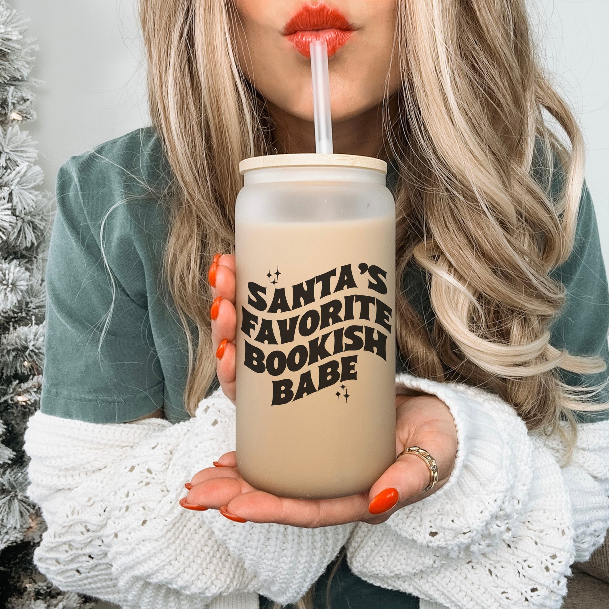 Santa’s Favorite Bookish Babe Frosted Glass Cup w/Bamboo Lid & Straw