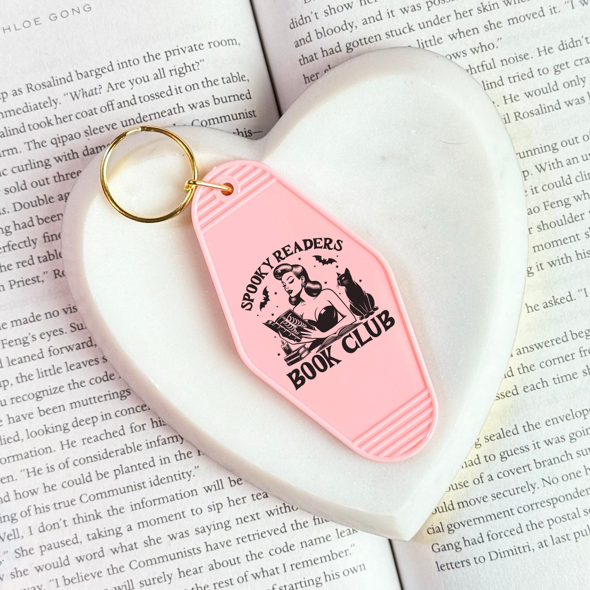 Spooky Readers Book Club Motel Keychain | Retro Halloween Bookish Accessory with UVF Decal